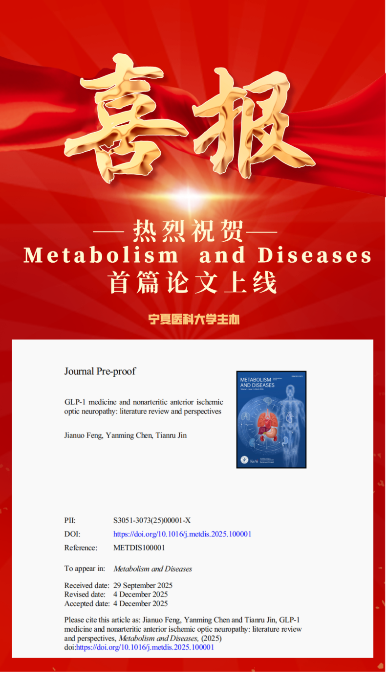 学校主办英文期刊《Metabolism and Diseases》首篇论文“GLP-1 medicine and nonarteritic anterior ischemic optic neuropathy: literature review and perspectives”于2025年12月8日正式上线,这不仅标志着《Metabolism and Diseases》在推动代谢与疾病研究方面迈出了重要的一步,也意味着《Metabolism and Diseases》开启了其在医学相关领域学术传播的新阶段。