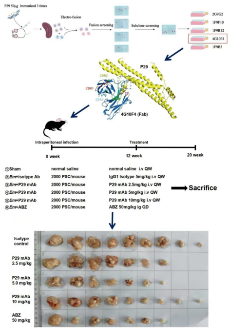 该研究利用杂交瘤技术生成了针对P29的五种单克隆抗体,其中4G10F4 单克隆抗体展现出最高的抗原特异性结合能力。进一步研究表明,4G10F4在体内和体外实验中均对泡型包虫病模型治疗表现出显著效果。体外实验中,4G10F4通过补体依赖的细胞毒性机制,显著抑制了棘球绦虫原头蚴和原代细胞的活力。体内实验表明,经4G10F4治疗的小鼠寄生虫负荷显著降低,且肝脏棘球蚴病灶数量明显减少。病理分析揭示,治疗后棘球蚴内部结构严重破坏,特别是生发层和片层受到影响,导致转化为无生育能力的囊泡。此外,通过评估小鼠体重和肝肾功能,确认了4G10F4用于泡型包虫病治疗的安全性。这一研究成果为泡型包虫病的治疗提供了新的思路和希望。
