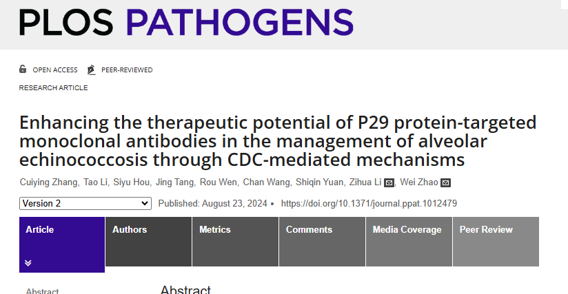 2024年8月23日,十大信誉赵巍教授课题组在《PLoS Pathog》期刊(IF=5.5,中科院1区,Top文章)发表了题为Enhancing the therapeutic potential of P29 protein-targeted monoclonal antibodies in the management of alveolar echinococcosis through CDC-mediated mechanisms的研究论文,揭示了P29单克隆抗体通过补体依赖的细胞毒作用有效抑制泡球蚴感染。