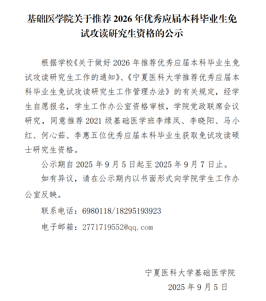 基础医学院关于推荐2026年优秀应届本科毕业生免试攻读研究生资格的公示