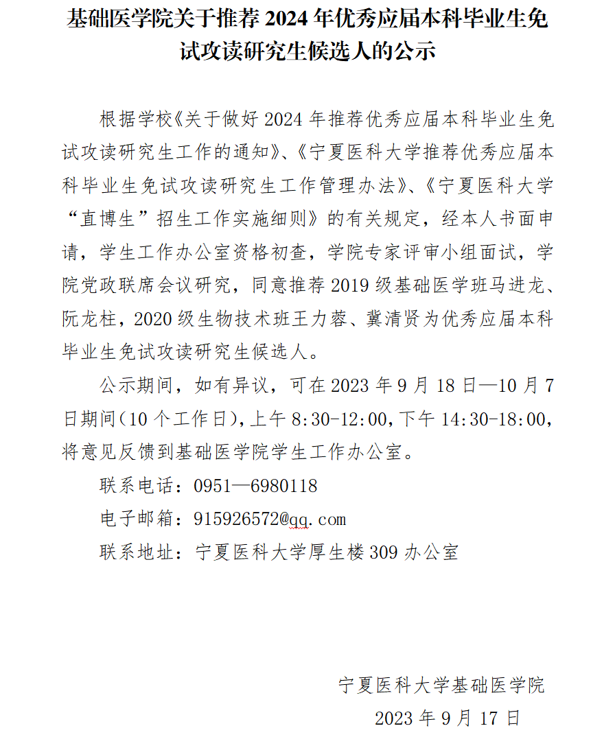 基础医学院关于推荐2024年优秀应届本科毕业生免试攻读研究生候选人的公示