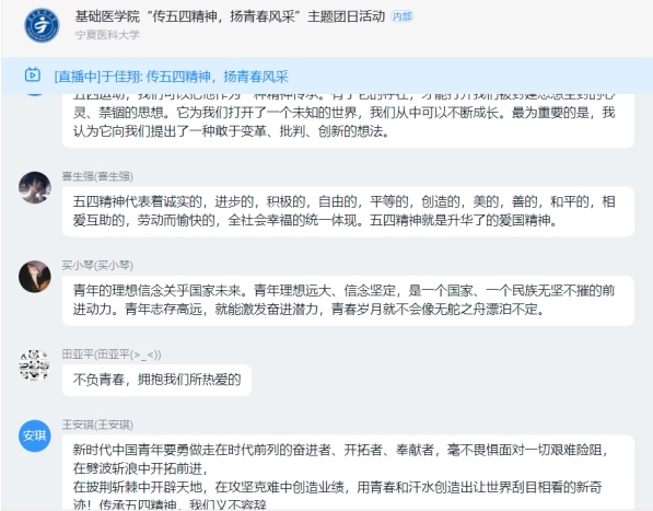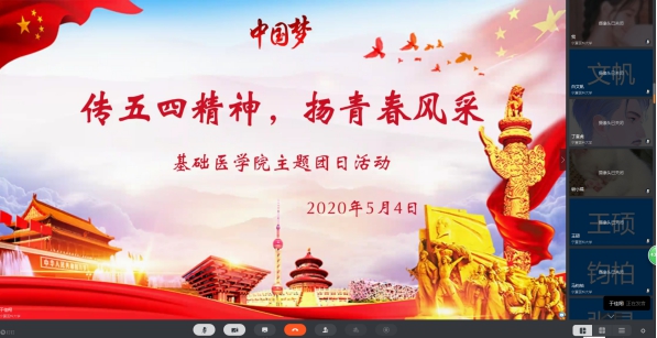 为弘扬“爱国、进步、民主、科学”的伟大五四精神,引导团员青年“坚定理想信念,站稳人民立场,练就过硬本领,投身强国伟业”。5月4日上午,基础医学院在钉钉平台上开展了纪念五四运动101周年“传五四精神,扬青春风采”线上主题团日活动,深入学习习近平总书记重要讲话精神。学院党委书记周文韬、副书记马立虎及团总支书记杨兴莲和200多名青年学生参加了活动。活动由于佳翔同学主持。