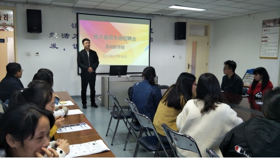 10月18日上午,基础医学院在厚生楼三楼书香学苑举办专场招聘会。由核子基因张鑫泽总经理主持,2016级生物技术班全体毕业生参加,学院侯绍章副院长主持了招聘会。