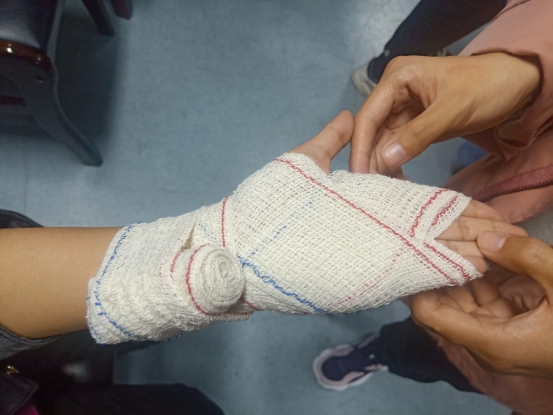 本次急救知识培训包括急救知识讲座、现场心肺复苏救护、绷带包扎示范和考核四部分。首先,主持人介绍了现代急救以及心肺复苏术的概况,重点强调了徒手心肺复苏术是在意外现场针对心跳骤停立即采取的紧急抢救措施,黄金4分钟的抢救最有意义等知识。志愿者做了心肺复苏现场示范、手部绷带包扎和三角巾包扎法绷带包扎的现场教学,并指导各位同学进行现场练习。最后,对培训学生进行现场考核,参加此次培训的65人全部通过考核,取得红十字救护员资格。
