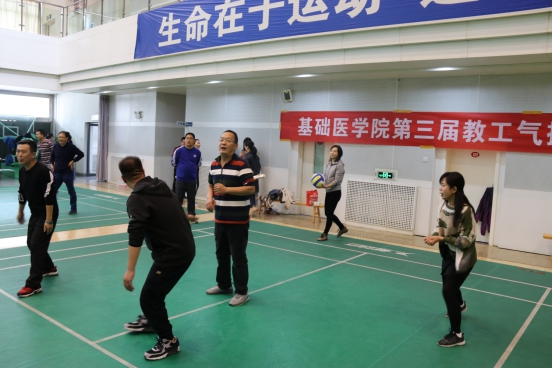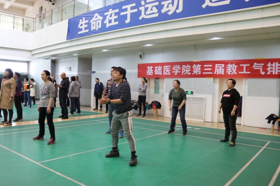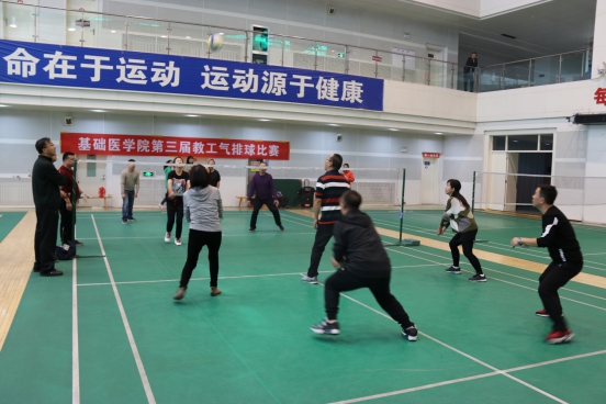 为了缓解我院教职工的工作压力,培养教职工锻炼身体的良好习惯,全面提高教职工的身体素质,促进我院精神文明建设,活跃校园文化生活,进一步推动教职工参与体育活动积极性,由基础医学院分工会组织的全院教职工气排球比赛,于10月25日中午在学校弘毅体育馆拉开帷幕。