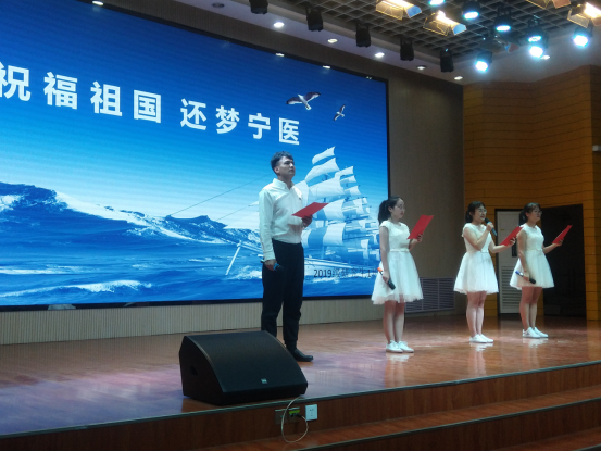 由54名同学组成的13支参赛队伍依次登台朗诵,选手们精神饱满、感情充沛,以满腔的热情表达了对祖国母亲70华诞的祝福和歌颂,充分展现了他们的普通话功底,抒发了浓浓的爱国之情。《我和我的祖国》、《我爱十月》、《传奇中国》、《新生的祖国》等朗诵篇章讲述了新中国在艰难之中的不断崛起,共产党带领人民从站起来到富起来到强起来的历史传奇。2019级研究生汤业珍等4人带来的原创作品《祝福祖国 圆梦宁医》更是真情实意的表达了对祖国母亲美好的祝愿。“弹唱着今日辉煌的旋律,七十载风雨兼程,我们一直都在路上”;“祝我祖国,繁荣昌盛;愿我宁医,桃李芬芳。”表达了宁医人不忘初心,牢记使命,奋进新时代,建设新宁医的决心。