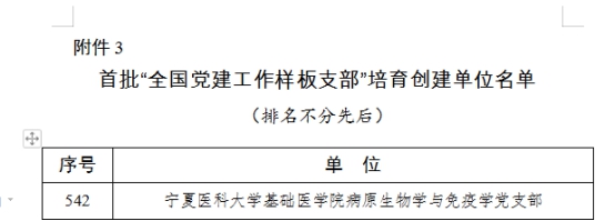 近日,教育部公布了首批全国党建工作示范高校、标杆院系、样板支部培育创建单位名单,共评出10个党建工作示范高校、100个党建工作标杆院系、559个党建工作样板支部。宁夏共有7个高校基层党支部获批“全国党建工作样板支部”培育创建单位,我院病原生物学与免疫学党支部入围。