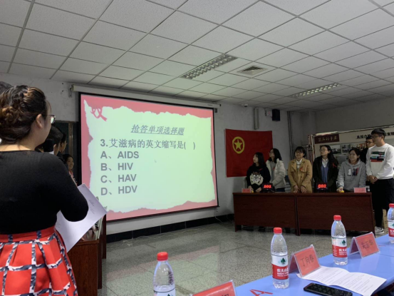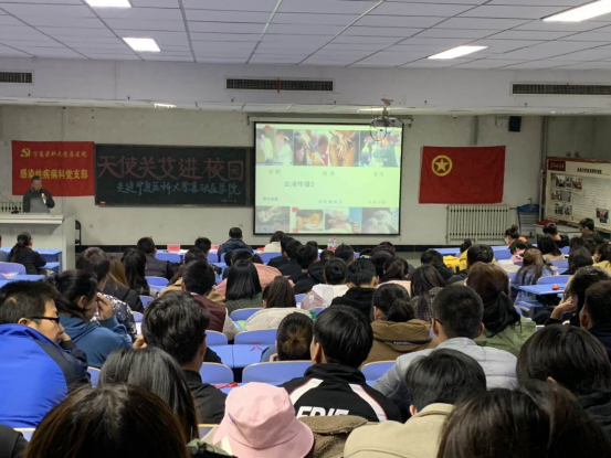 11月4日下午的防“艾”知识竞赛现场,气氛热烈,经过来自基础医学院2017、2018基础医学和生物技术专业的四个代表队共12名同学的激烈角逐,最终2017级基础医学班荣获第一。在随后的科普专题讲座中,自治区艾滋病二线治疗专家组专家、总医院感染疾病科主任医师张栩通过病例图片展示的方式,从艾滋病的产生、预防以及目前我国艾滋病病例变化情况进行了详细讲解,呼吁同学们关注艾滋病患者,积极参与到预防艾滋病志愿服务工作中。此次系列活动还征集到主题宣传海报40余幅,并评出一等奖2个、二等奖4个、三等奖6个。