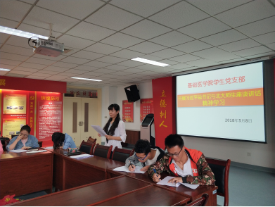 2018年5月8日,基础医学院组织全体学生党员集体学习习近平总书记在北大师生座谈上讲话,并进行了党的建设《应知应会》知识测试。