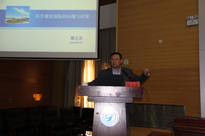 在讲座中,霍正浩处长就教育地本质、世界医学教育的发展、我国医学教育面临的问题与对策等方面做了宣讲。指出:医学教育改革要树立成人教育理念、教师的责任实施以学生为中心的教育模式。教学主体从以教师为中心转变为以学生为中心;从考虑教师教什么转变为重点考虑学生学什么、能得到什么;重点研究教师如何教转变为重点研究学生如何学从重点评教师教得怎么样转变为既评教师教得怎样,又评学生学得如何;从课堂为主转变为课堂、实验室、图书馆、网络、社会现场相结合的教学。