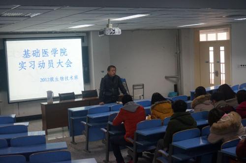 2015年12月10日上午,基础医学院2012级生物技术专业学生实习动员大会在厚重楼201教室召开。学院党委书记周永伟、学院教学办公室主任张鸣号和2012级生物技术专业全体本科生参加了此次动员大会。