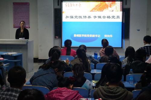 为了全面贯彻落实“坚持标准、保证质量、改善结构、慎重发展”的方针,进一步提高入党积极分子的党的基础理论素养,端正入党动机,10月8日-14日,为期5天的基础医学院分党校第二十六期党课培训在厚生楼202教室如期开班。基础医学院、理学院和管理学院共58名入党积极分子参加了此次培训。