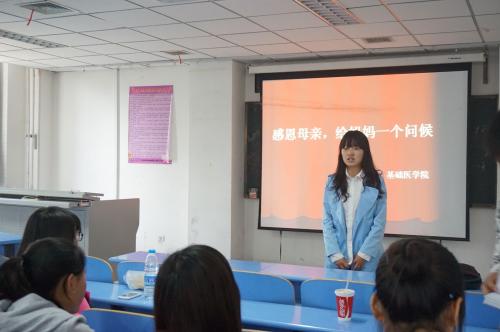 为了弘扬中华传统美德,让学生真正懂得以感恩之心、感恩之举回报母亲的养育之恩,在5月10日下午,母亲节来临之日,基础医学院以“感恩母亲,给妈妈一个问候”为主题的班会活动在厚生楼202教室开展。辅导员和学院全体同学参加了此次活动。
