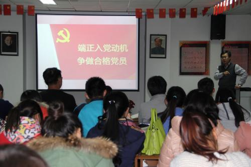 11月17日晚7点半,为了进一步加强基础医学院党组织建设,不断提高入党积极分子的政治理论水平、思想认识、政治素质,我院在厚生楼三楼“党员之家”开展了入党积极分子培训班。基础医学院、管理学院和理学院的入党积极分子40余人参加了本次培训。