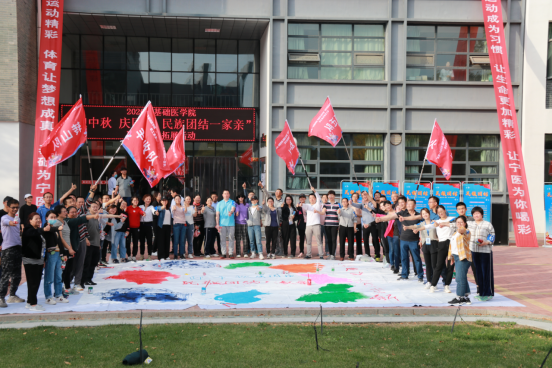 九月的宁医校园云淡风轻、晴空万里,为了增强教职工民族团结大家庭意识,庆祝新中国成立71周年和喜迎中秋佳节。9月25日下午,基础医学院在雁湖校区厚生楼前开展“迎中秋,庆国庆,民族团结一家亲”职工素质拓展活动,学校党委统战部和工会负责人、基础医学院党政班子成员及全体教职工参加了活动。