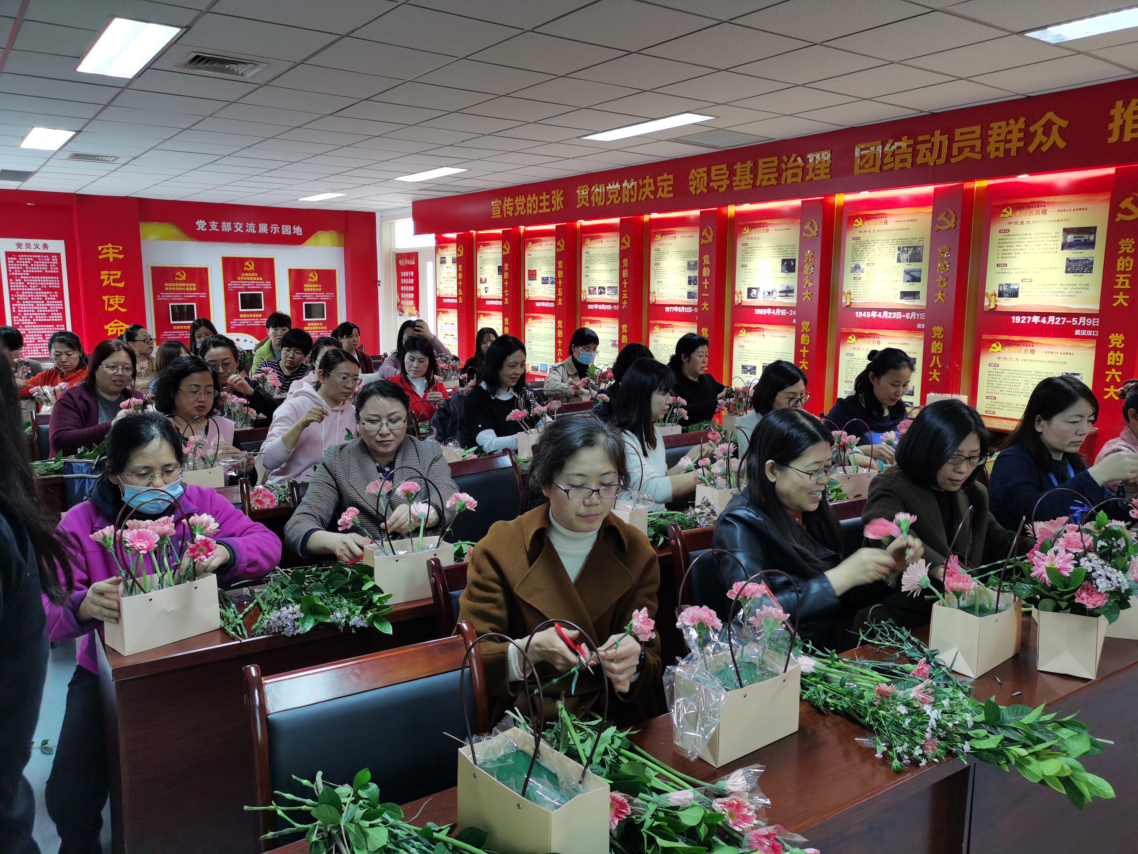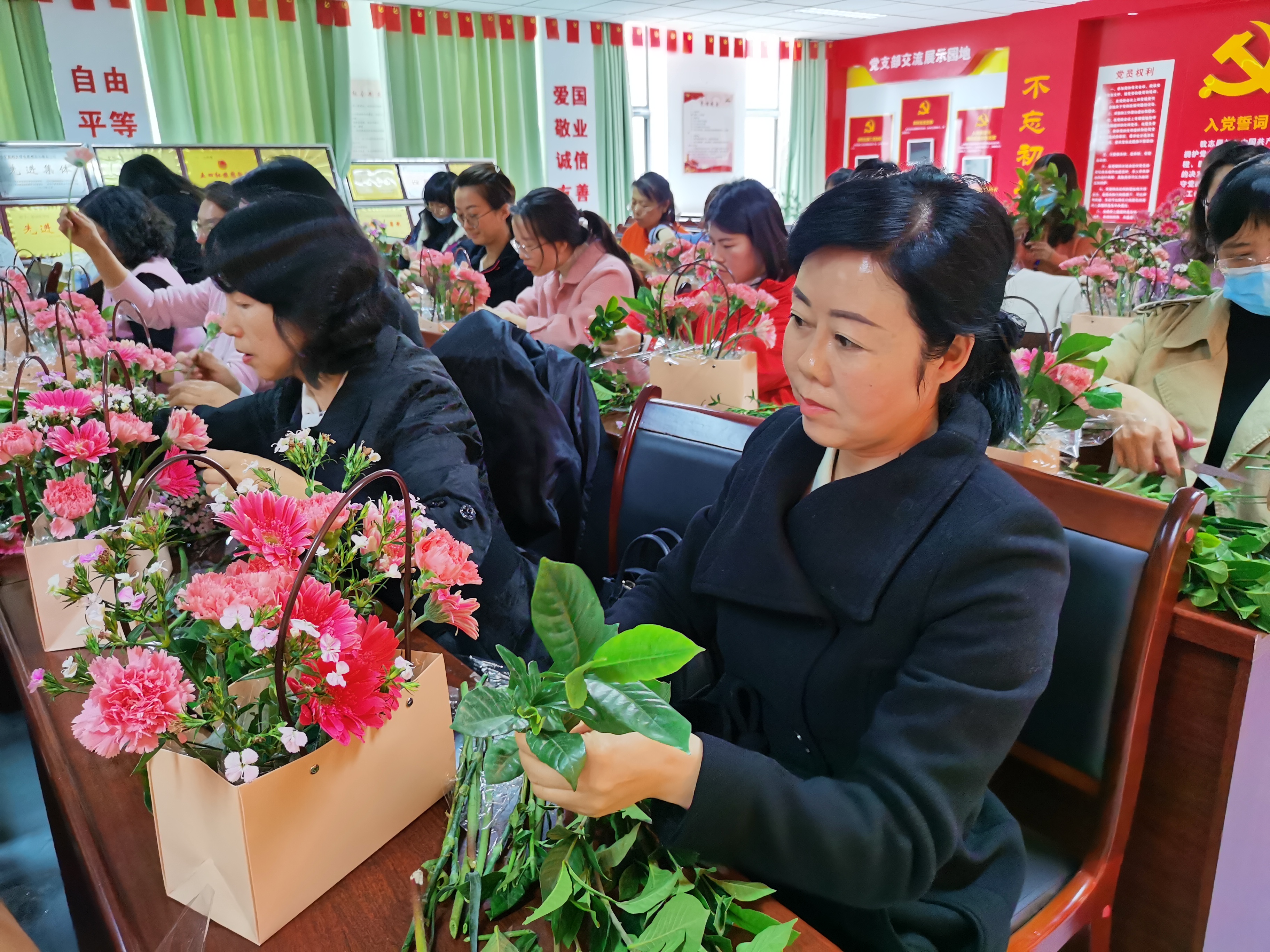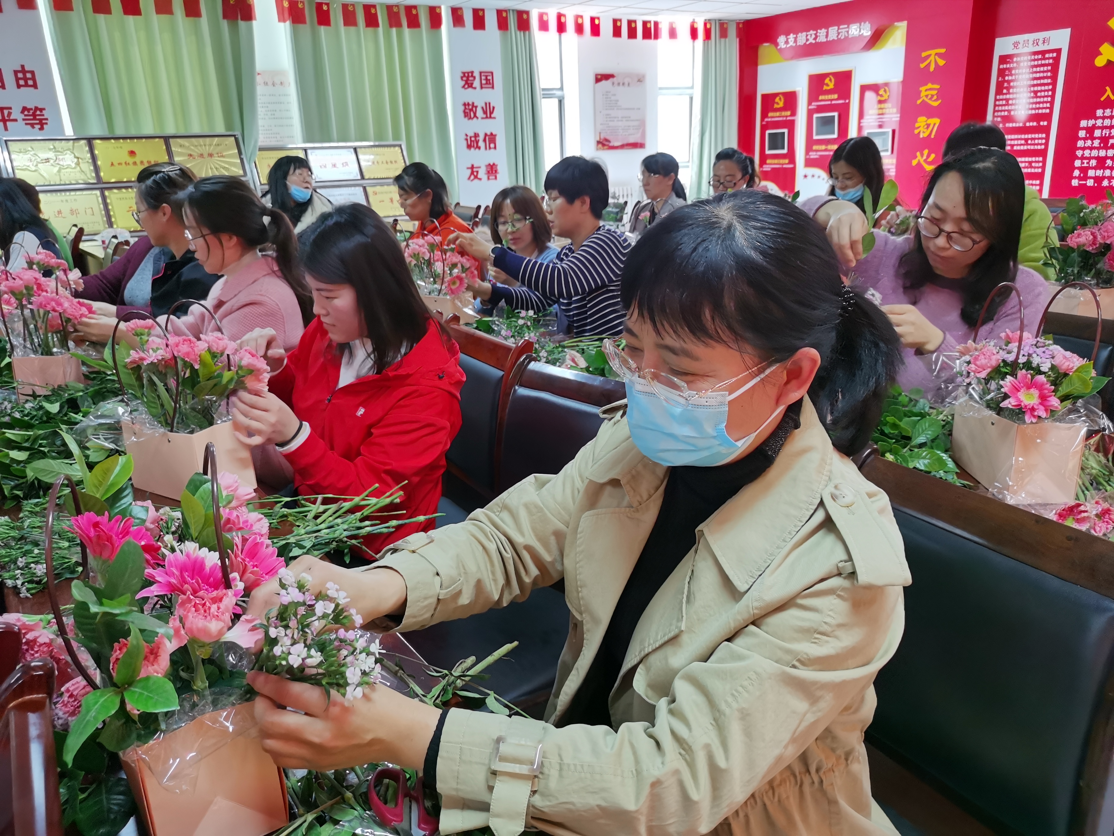 2021年3月8日下午组织女职工观看电影《你好,李焕英》。3月10日中午组织女职工开展“与花共舞,绽放美丽”插花制作活动。在专业插花师的悉心指导下,女老师们用自己灵巧的双手,尽情发挥想象力、创造力,整合造型,修剪枝叶,使得原本普普通通的花草经她们的巧手摆插后,错落有致地搭配在了一起,插出了漂亮美丽的花篮,陶冶了身心健康,增添了节日气氛。