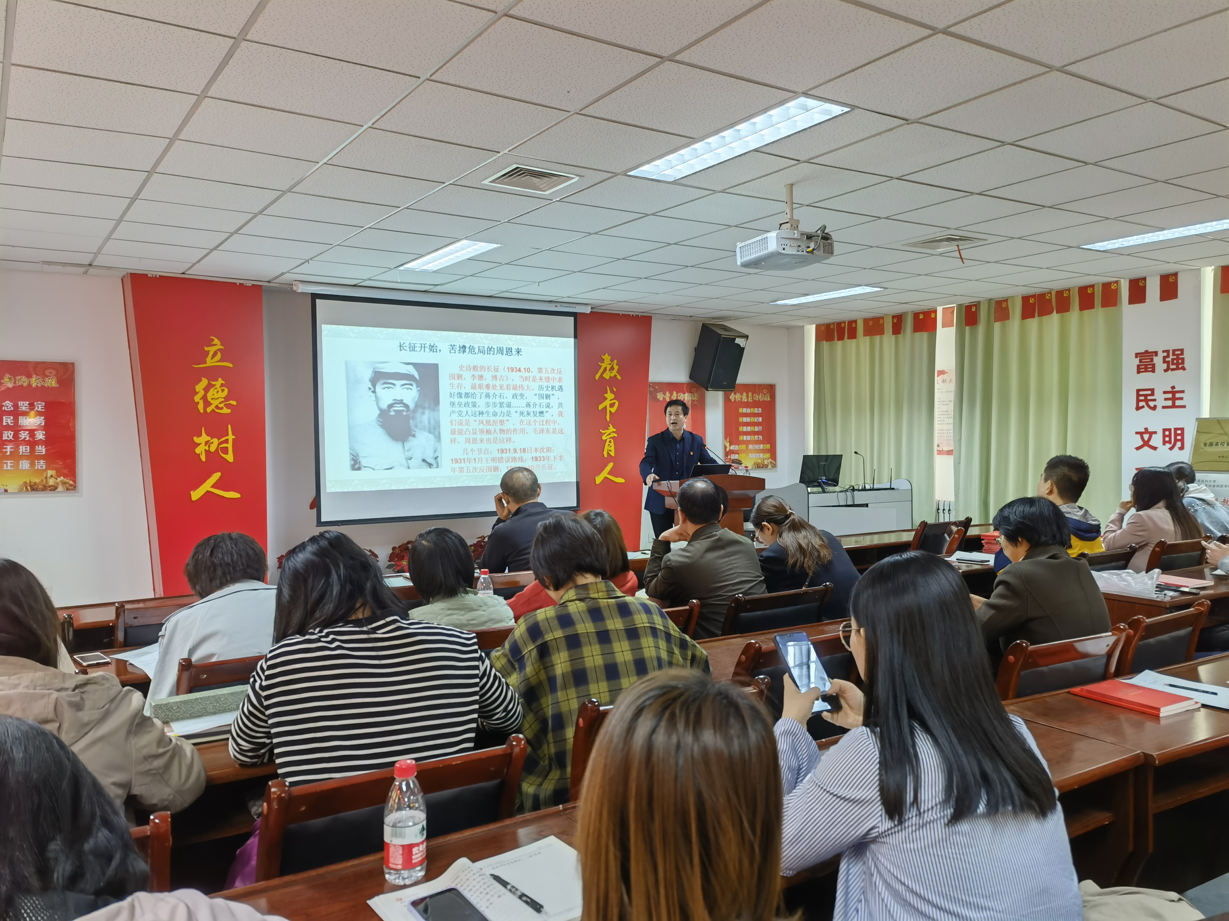 专题党课环节,学院党委副书记马立虎以“在党史学习教育中传承老一辈革命家精神”为主题,为全体党员讲了一堂生动的专题党课。他首先详细阐述了党中央开展党史学习教育的重大意义,强调全体党员领导干部要通过党史学习教育鼓舞斗志、明确方向,坚定信念、凝聚力量,启迪智慧、砥砺品格,要将学习真正转化为推动干事创业的强大精神力量和学院高质量发展的重要引擎。随后,他以周恩来同志人物传记故事为例,从“以老一辈革命家为镜,强化党性修养”和“传承老一辈革命家精神,赓续红色基因血脉”两个方面,带领全体同志回顾了党的光辉发展历程和取得的伟大成就。党课最后,他号召全体党员要以老一辈革命家为楷模,学习他们“积极进取、刻苦好学、甘当公仆、团结协作、敢于创新、严于律己、无私奉献”的精神,为夺取全面建设社会主义现代化国家,实现中华民族伟大复兴而不懈努力。