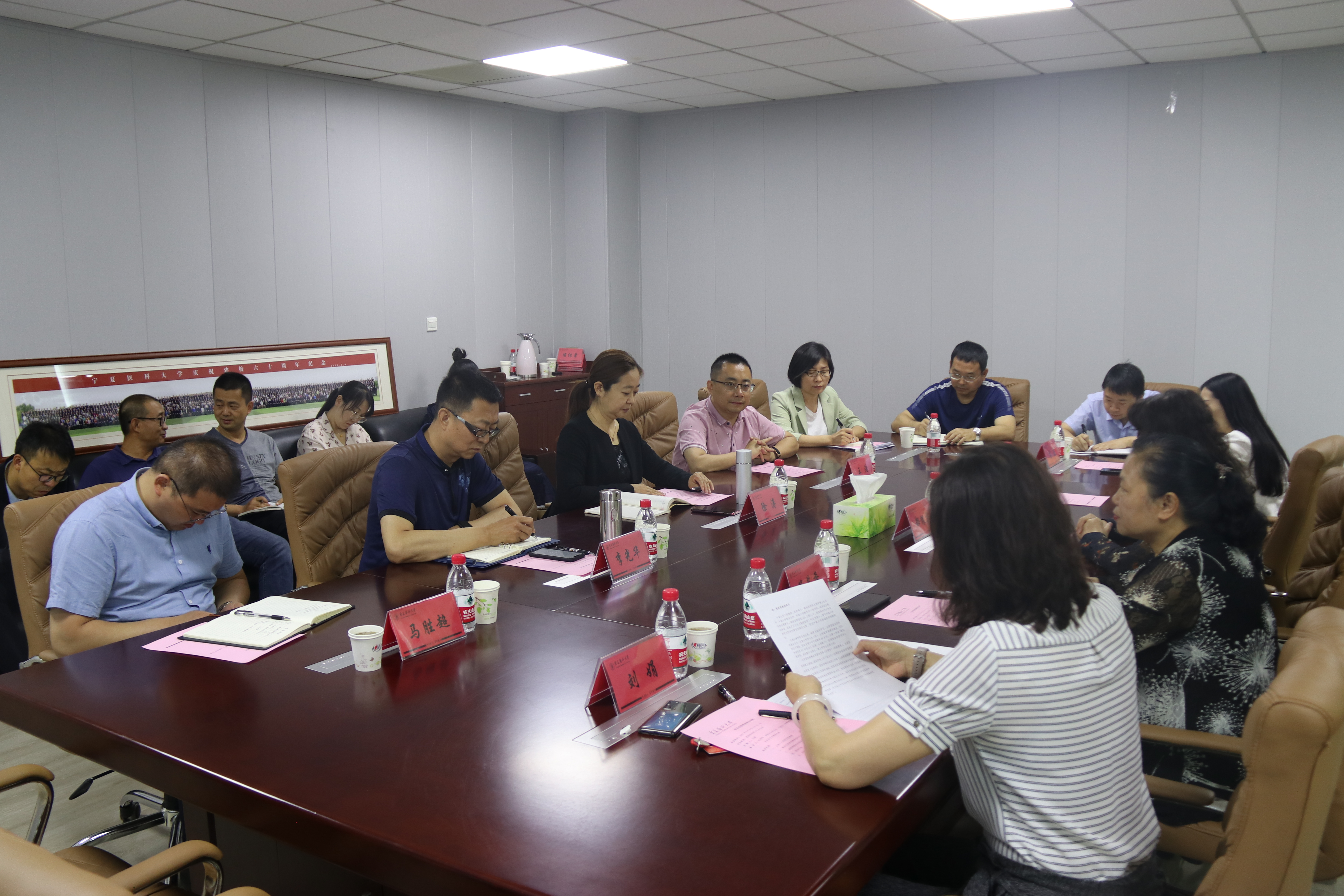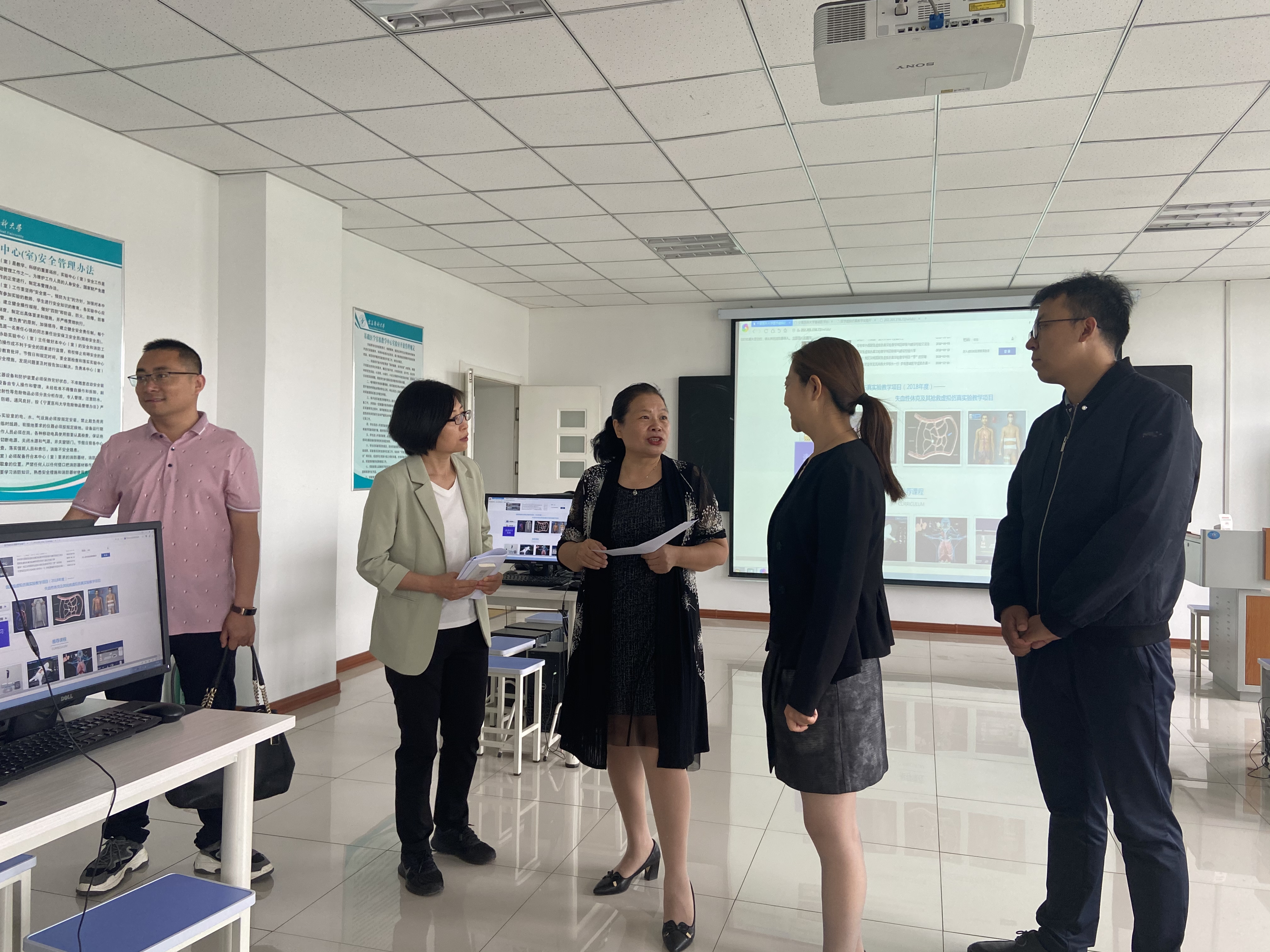 管茶香教授首先实地走访参观了国家级基础医学实验教学示范中心,新解剖大楼以及虚拟仿真教学实验中心。随后来到基础学院与学院全体领导班子、国家卫健委代谢性心血管疾病研究重点实验室副主任以及学院系部主任参加交流座谈,郝银菊副校长出席并参加座谈会。