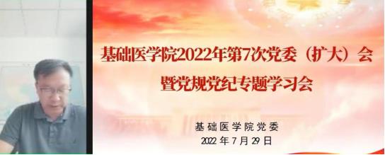 7月29日上午,基础医学院党委召开党委(扩大)会暨党规党纪专题学习会,对学校党委《关于开展违规收送红包礼金和不当收益及违规借转贷或高额放贷专项整治工作》进行安排部署。会议采取线上形式进行,旨在强化政治担当、履行政治责任、净化政治风气,狠抓作风建设、坚守法纪意识、提高党性觉悟。学院党委委员及班子成员,各党支部书记、学系(中心)主任和各办公室主任参加会议,会议由学院党委书记周文韬主持。