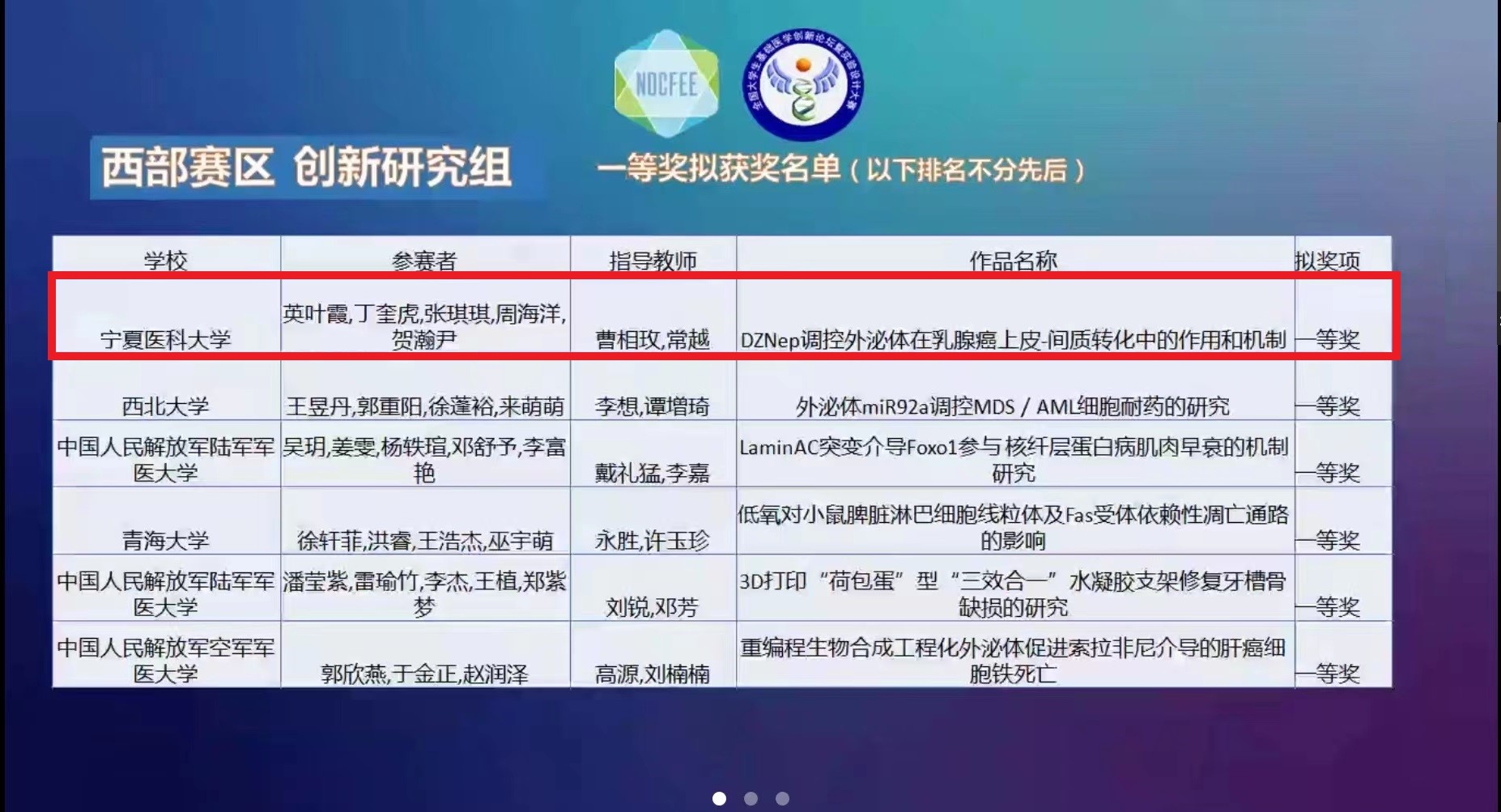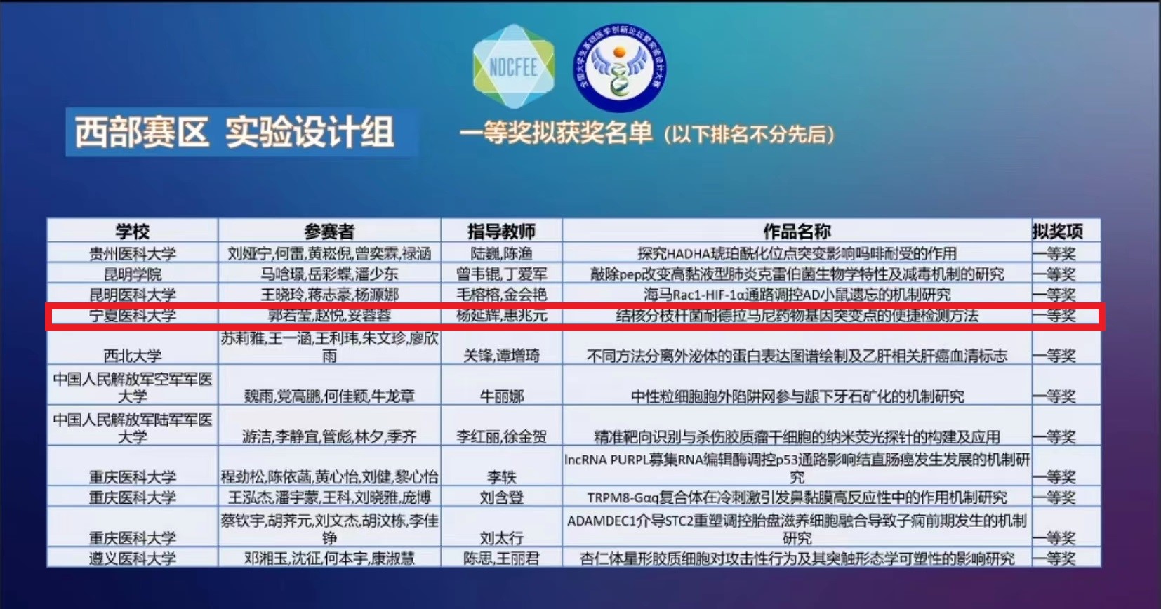 2022年11月18-20日,由高等学校国家级实验教学示范中心联席会基础医学组和高等学校基础医学创新创业协同育人工作组主办,澳门十大信誉好的网站、南京医科大学、四川大学、大连医科大学、武汉大学联合承办的第八届全国大学生基础医学创新研究暨实验设计论坛本科院校复赛,经过两天线上的激烈角逐圆满落下帷幕。十大信誉共选派的12支代表队参加了本次复赛,其中英叶霞团队项目荣获西部赛区创新研究组一等奖(指导教师:曹相玫,常越),郭若莹团队项目荣获西部赛区实验设计组一等奖(指导教师:杨延辉,惠兆元),欧阳佳卉团队荣获西部赛区实验设计组二等奖(指导教师:何瑞,黑常春),汪南团队荣获预防医学赛道实验设计组二等奖(指导教师:杨建军,张艳男),这是论坛在增加分区赛以来十大信誉取得的最好成绩。