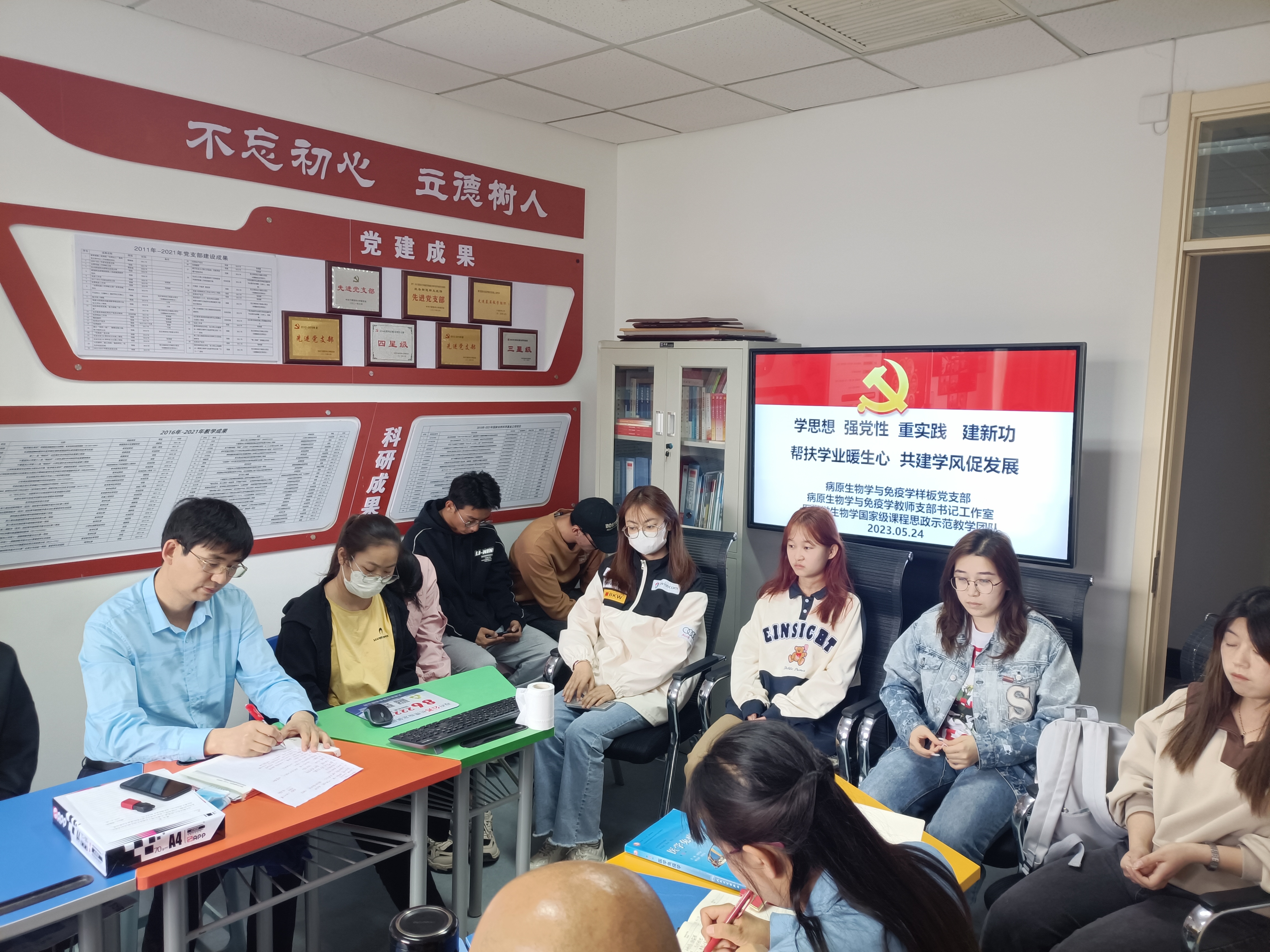 5月24日中午,病原生物学与免疫学样板支部在厚生楼404“双带头人”工作室,组织2021级临床医学及儿科学专业本科生在“医学微生物学”和“医学免疫学”期中考试中成绩靠后的25名同学,开展“帮扶学业暖生心 共建学风促发展”学情教情反馈交流会。帮助学生查找各自学习的不足之处,给出了学习方法及建议,引导学生不忘初心,坚定信念,努力学习,自我突破。将课程思政教学从课堂延伸到课下,扎实推进主题教育的“重实践”和“以学促干”。