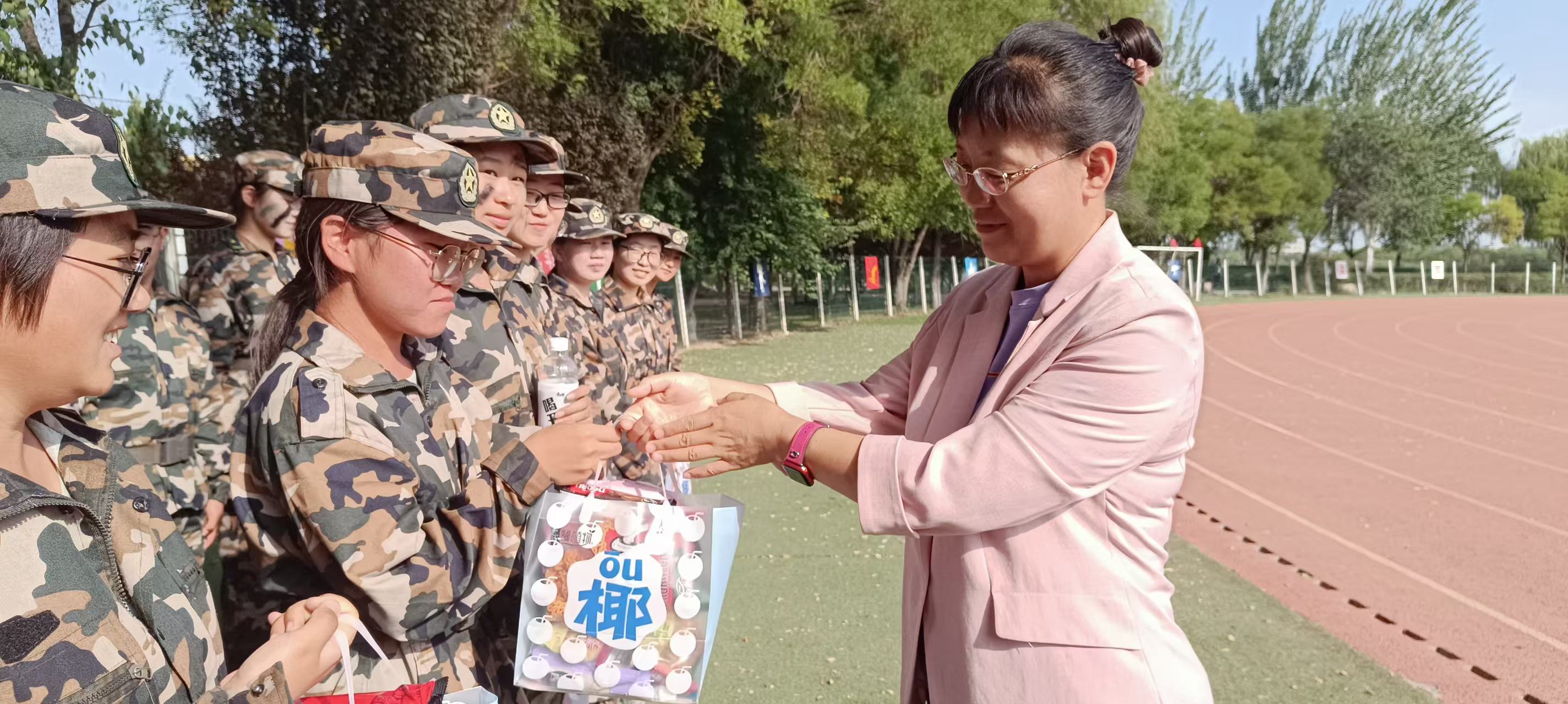 慰问现场学院党委书记张艳丽代表学院向新生们致以亲切问候,对他们不畏酷暑、坚持训练的表现给予高度赞扬,充分肯定了大家在军训中展现出的青春朝气和坚韧意志。学院领导勉励同学们将军训视为大学的“开学第一课”,在烈日炙烤与队列训练中锤炼意志,在团队协作与互帮互助中凝聚集体力量既以军人的严明纪律规范言行,又以医者的仁心大爱涵养品格、践行初心学院领导还一起为同学们分发了慰问品,与大家亲切交流,细致询问饮食、住宿和身体适应情况,叮嘱训练务必注意规范和安全,遇到困难及时向老师或教官反映。一份份精心准备的礼物新生们脸上绽放出灿烂的笑容感受到学院的关心关爱,大家纷纷表示,将继续以饱满的热情和昂扬的斗志完成后续训练任务。