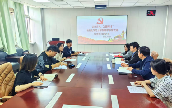 9月29日,基础医学院生物化学与分子生物学系党支部结合2025年党员基本培训第二次集中大课培训内容在厚生楼313会议室,组织全体党员开展了“为党育人、为国育才”集中学习研讨会。会议由支部书记姚青主持,学校组织部专职组织员张萍同志应邀参加并做了总结发言。