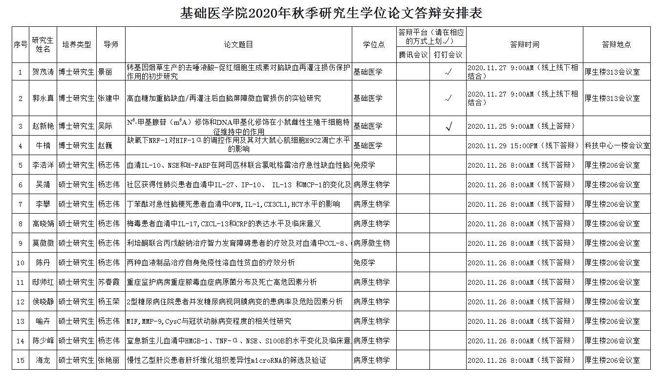 基础医学院2020年秋季研究生学位论文答辩安排表