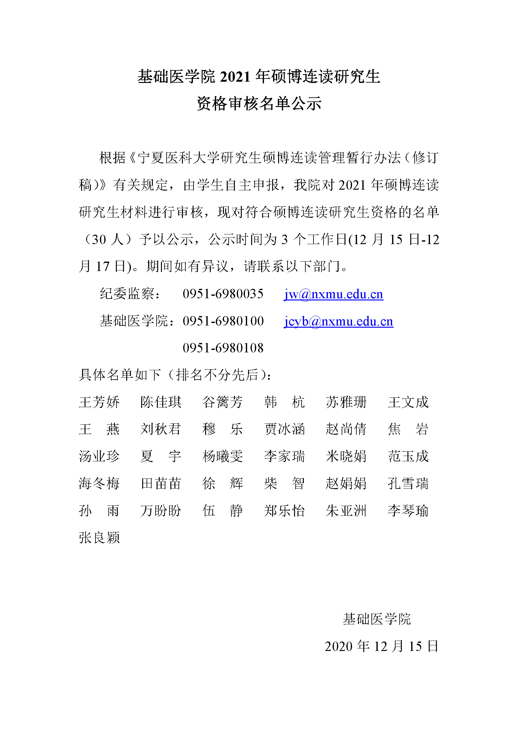 基础医学院2021年硕博连读研究生资格审核名单公示