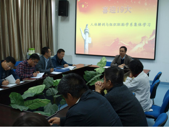 为迎接党的十九大胜利召开,2017年10月13日下午,人体解剖与组织胚胎学党支部开展了“喜迎19大”为主题的集体学习,韩怀钦副院长参加集体学习并为广大党员干部作了“树立信心,鼓足干劲,做合格党员的党课”。会议由支部书记黑常春同志主持,全系在岗教师及研究生代表30余人参加了学习。