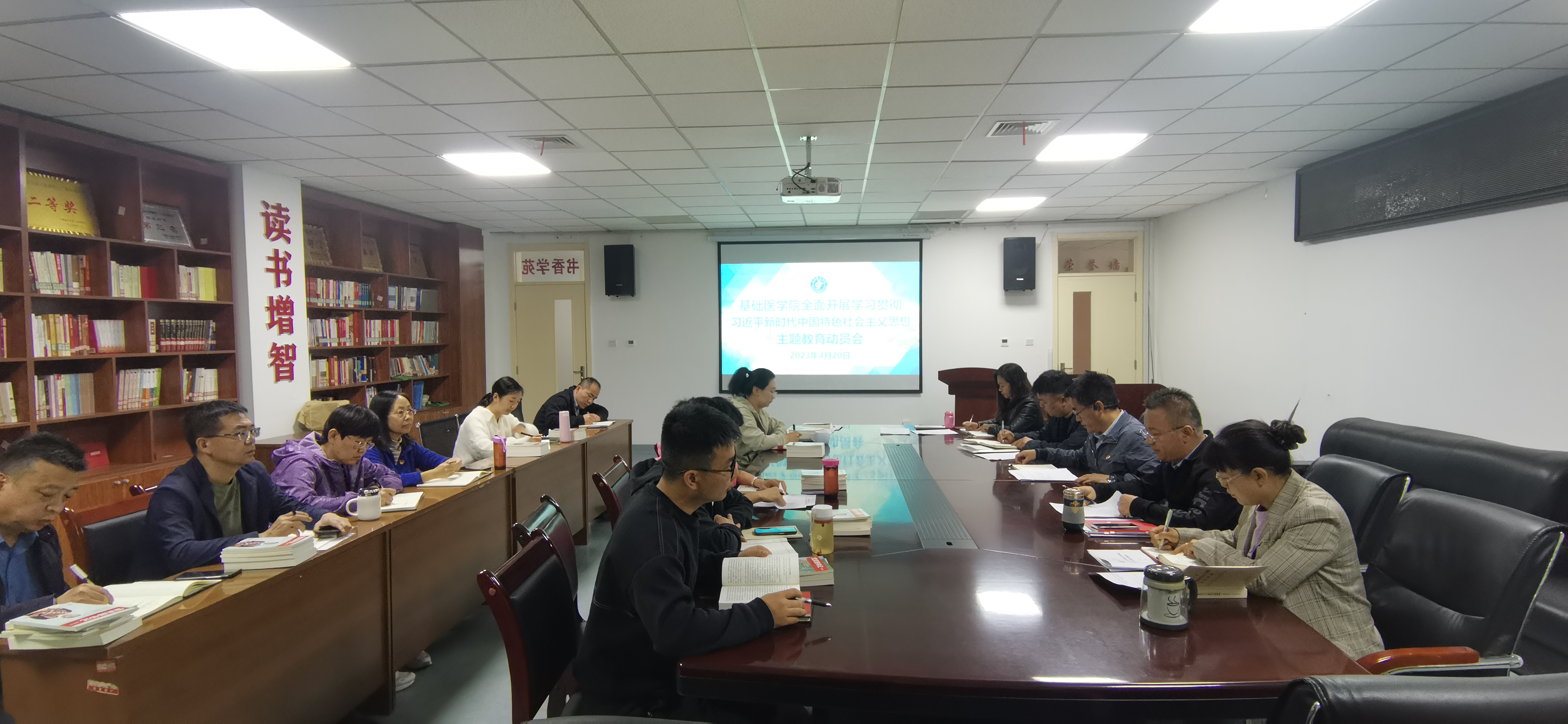 4月20下午基础医学院学习贯彻习近平新时代中国特色社会主义思想主题教育动员会书香学苑召开。会议认真学习贯彻习近平总书记在中央主题教育工作会议上的重要讲话精神党中央决策部署和自治区党委工作部署,对全开展主题教育进行安排部署。学校一联系督导组丁力涛应邀出席学院党委书记、院长牛建国主持并作动员讲话。