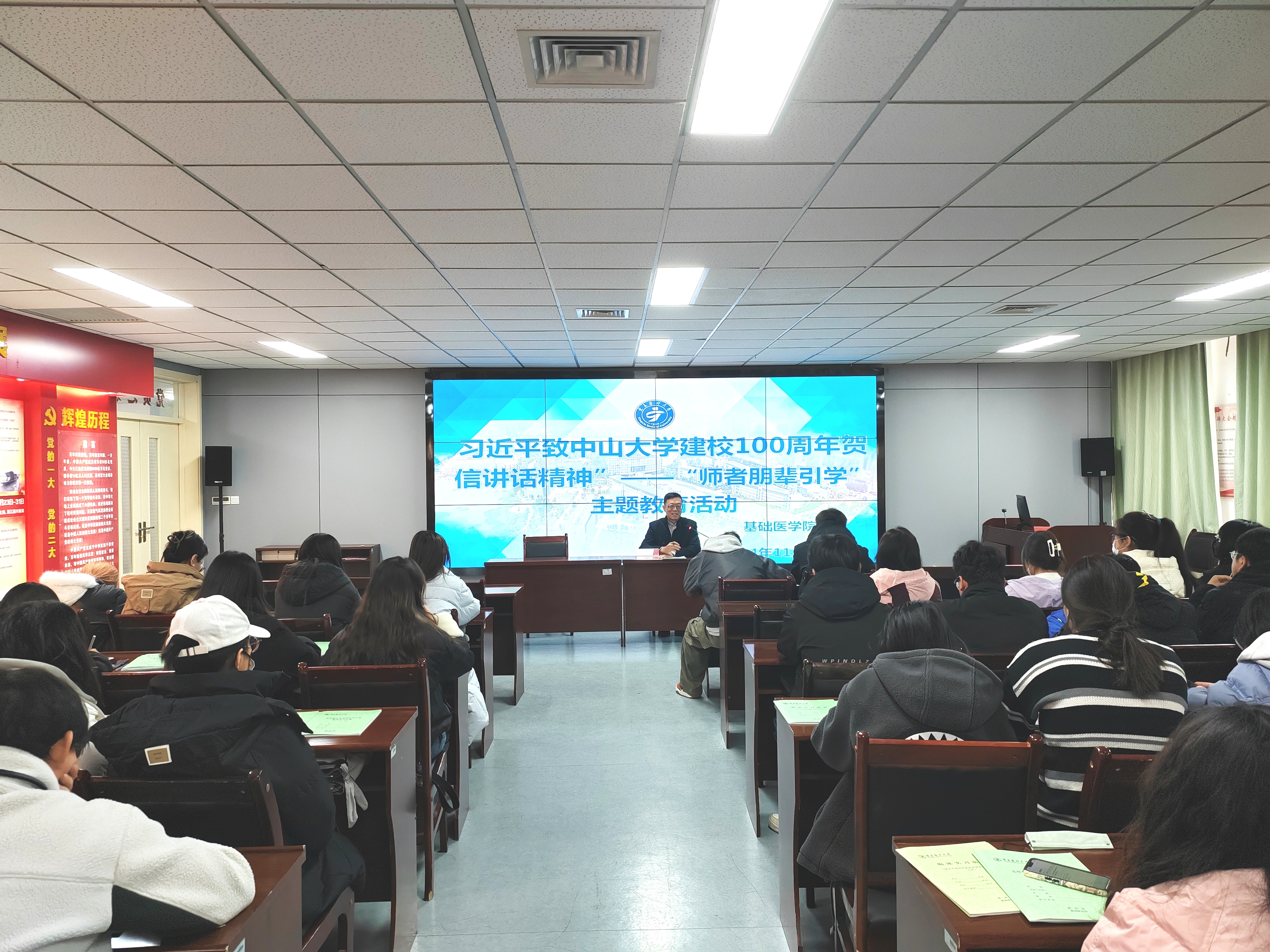 为厚植学生爱国情怀、提高创新精神,发挥青年一代的责任与担当,2024年11月19日基础医学院在厚生楼党员之家开展学习习近平致中山大学建校100周年贺信讲话精神——“师者朋辈引学”主题教育活动。本次活动由李光华副院长主讲,2021级基础医学班全体学生参加。