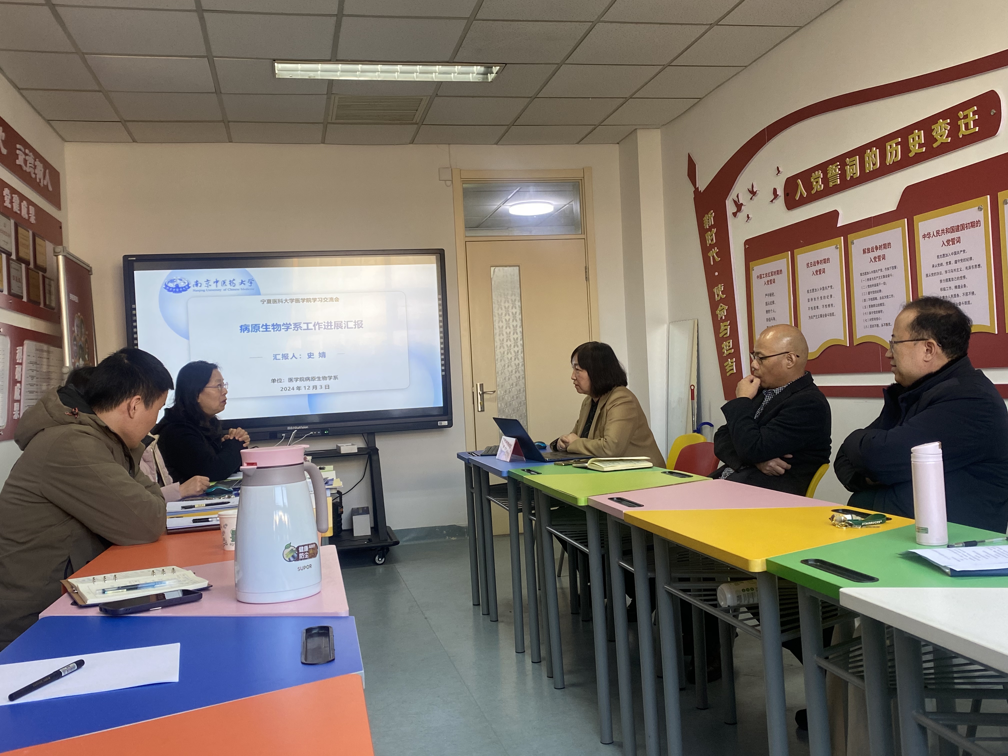 2024年12月3日上午,南京中医药大学医学院病原生物学系主任佟书娟及教师代表共4人,莅临十大信誉基础医学院病原生物学与医学免疫学系进行参观调研。在厚生楼404“双带头人”工作室举行了座谈,学系全体党员及无课教师参加了此次研讨。
