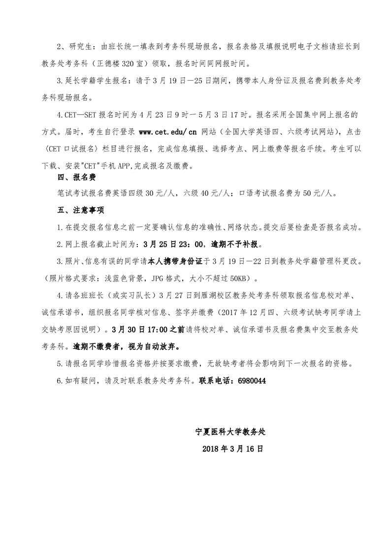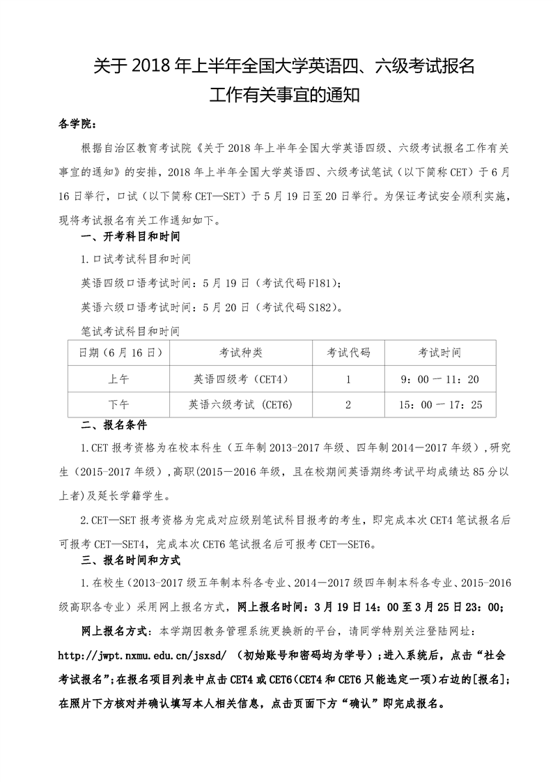 关于2018年上半年全国大学英语四、六级考试报名 工作有关事宜的通知
