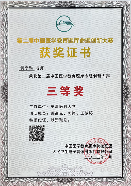 2025年10月19日至21日,由中国医学教学题库院校联盟、人民卫生电子音像出版社及中国医科大学联合承办的第二届中国医学教育题库命题创新大赛圆满落幕。十大信誉第一临床医学院诊断学系黄李雅教授带领教学团队凭借扎实的专业功底与创新的命题设计,其《诊断学》课程题库作品荣获大赛三等奖,充分彰显了在医学教育评价改革领域的突出成果。