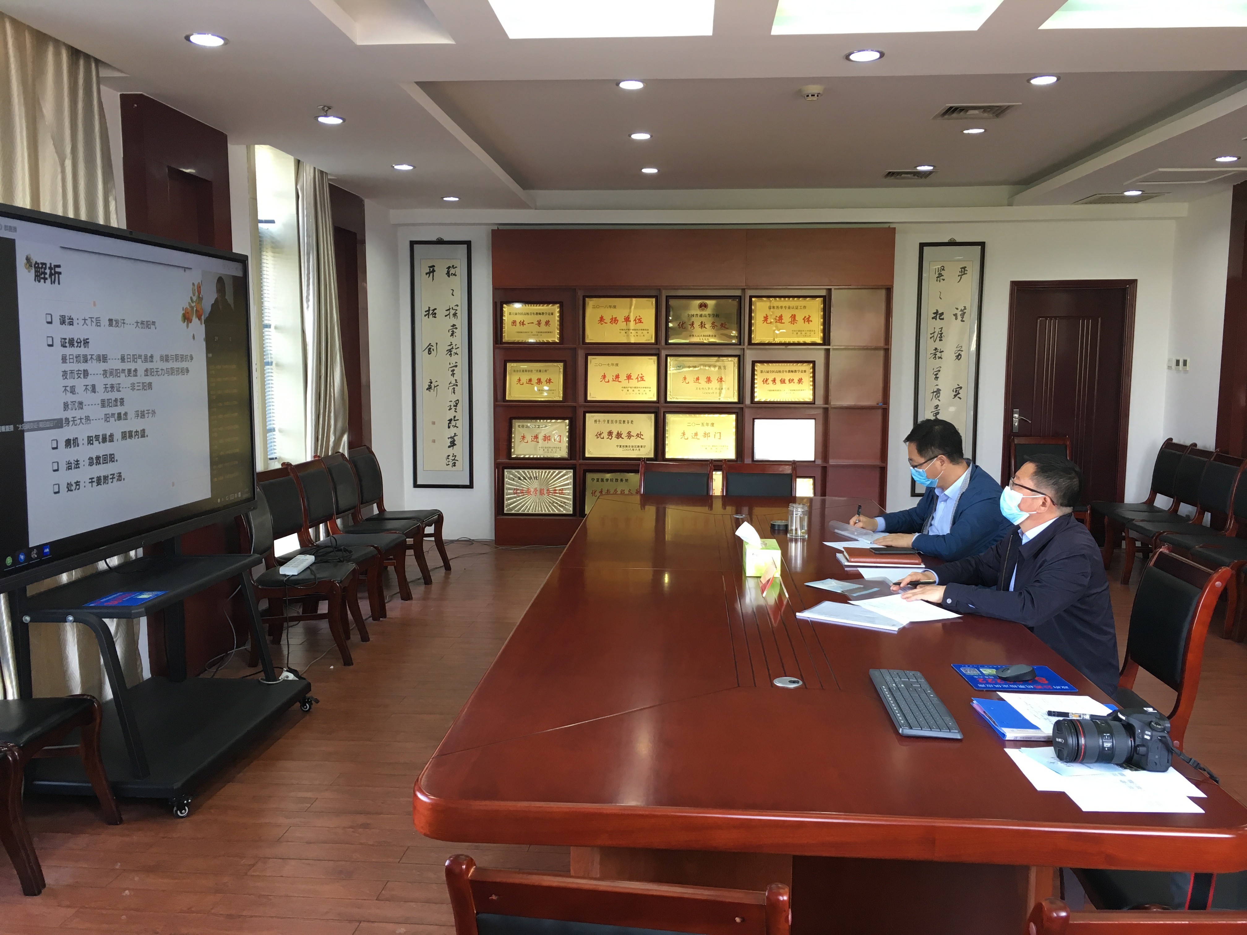 牛阳首先通过学校在线学习平台督导模块,查看了中医学院平台建课及使用情况。随后进入中医学院徐建虎老师讲授的《伤寒论》、郭建红老师讲授的《推拿功法学》、唐利龙老师讲授的《中医诊断学》及张皞珺老师讲授的《金匮要略》等线上直播课程,与同学们共听网课。