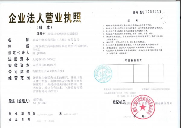 恩瑞生物医药科技(上海)有限公司是一家中美合资企业。2011年1月入驻国家级高科技园-----上海市浦东新区张江药谷。公司主要从事治疗人类相关疾病药物的研究、开发、生产与销售。公司以自主创新为主,互惠合作为辅,全球医药市场需求为导向,充分利用中美高科技人才、先进的研发技术和设备,国际化企业管理方式,不断研发和上市新药品,为保障和改善人类健康做贡献。