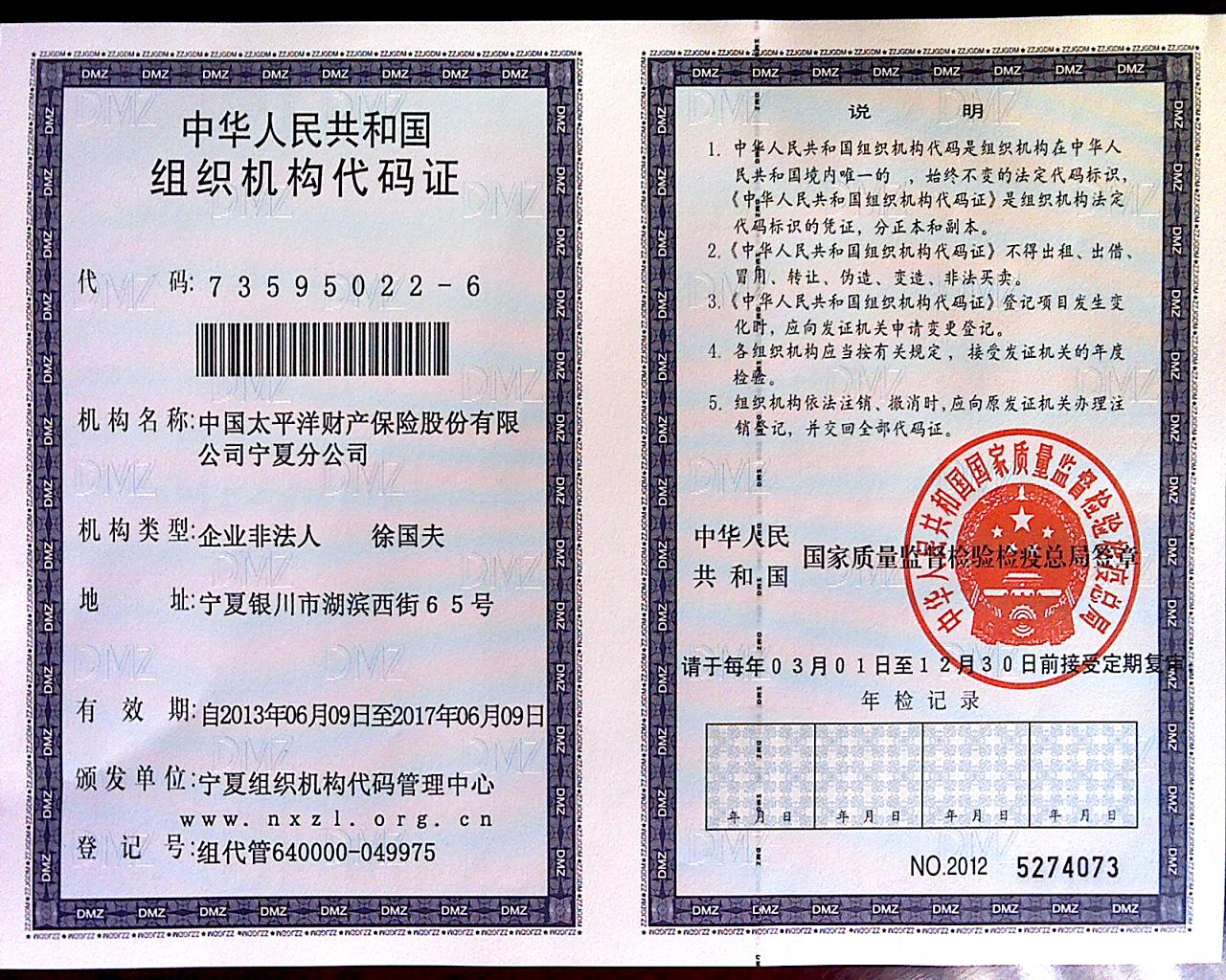 中国太平洋财产保险股份有限公司宁夏分公司于2002年10月25日开业,目前全区下辖11个分支机构,形成了比较齐全的服务网络。公司着力提升服务质量,构建诚信品牌,坚持“诚信天下、稳健一生、追求卓越”的企业核心价值观,始终用真心服务客户,用爱心承担保险责任,在积极追求自身发展的同时,还致力于各类公益事业,积极开展关爱孤残、扶贫赈灾等公益活动,精心打造“一家负责任的保险公司”品牌,全力为构建和谐宁夏保驾护航。公司成立以来为150多名下岗职工提供再就业工作岗位,接收大中专院校毕业生和部队复员军人40多人,有力地支持了宁夏经济建设,并维护了社会稳定,起到了“经济助推器”和“社会稳定器”的作用。