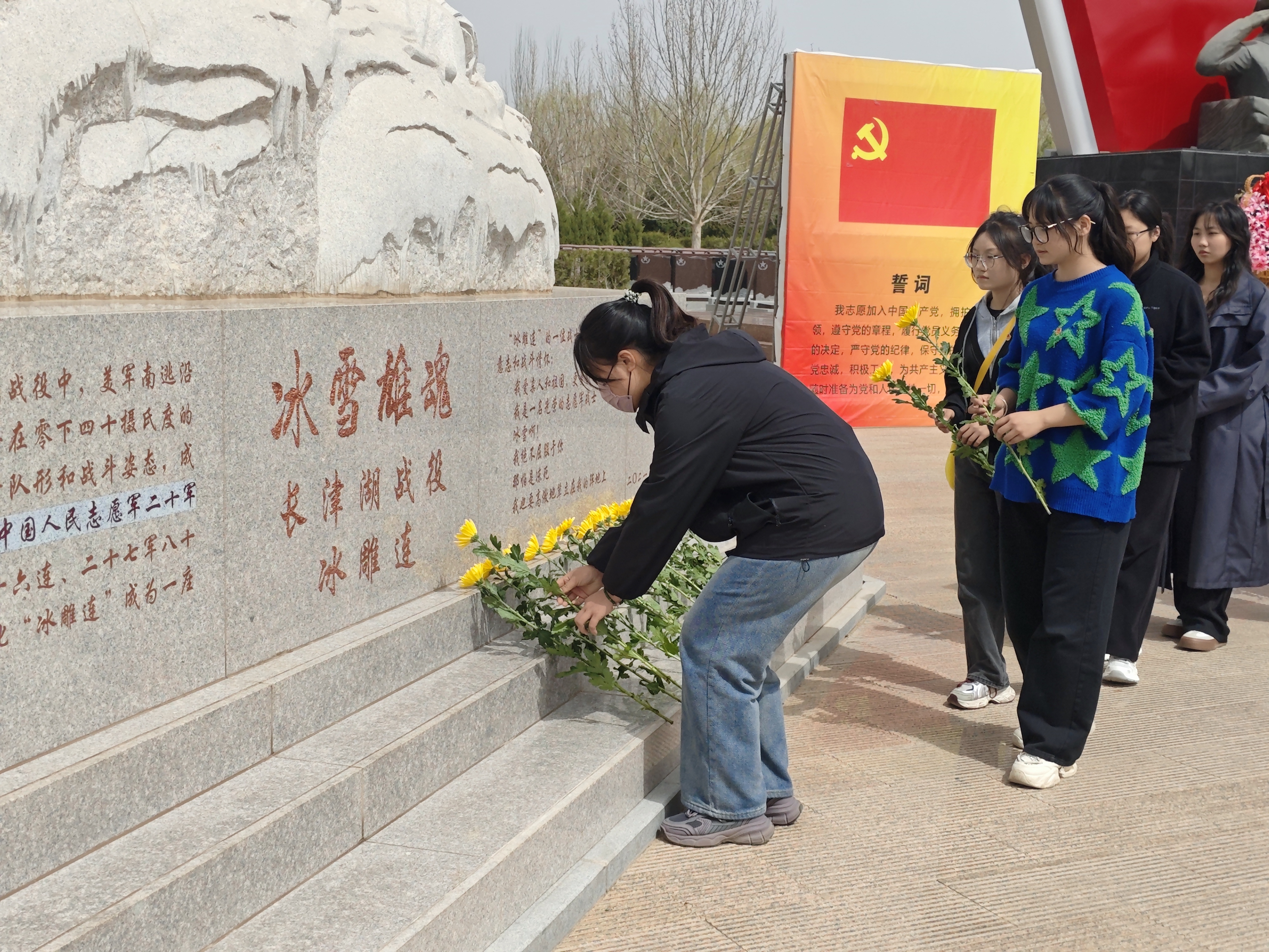 在庄严肃穆的氛围中,全体人员肃立在“冰雪雄魂”雕塑前三鞠躬,双手轻放、面色崇敬、敬献鲜花,感悟着革命精神,牢记着先烈们的丰功伟绩。在“冰雕连阵地战壕”雕塑前,全体团员面对团旗,重温入团誓词,庄严宣誓,铿锵有力的誓言回荡在陵园上空。“作为新时代医学生,我们不仅要继承先烈们的奉献精神,更要锤炼救死扶伤的专业本领。”团员代表张宇晗同学在分享感悟时如是说。