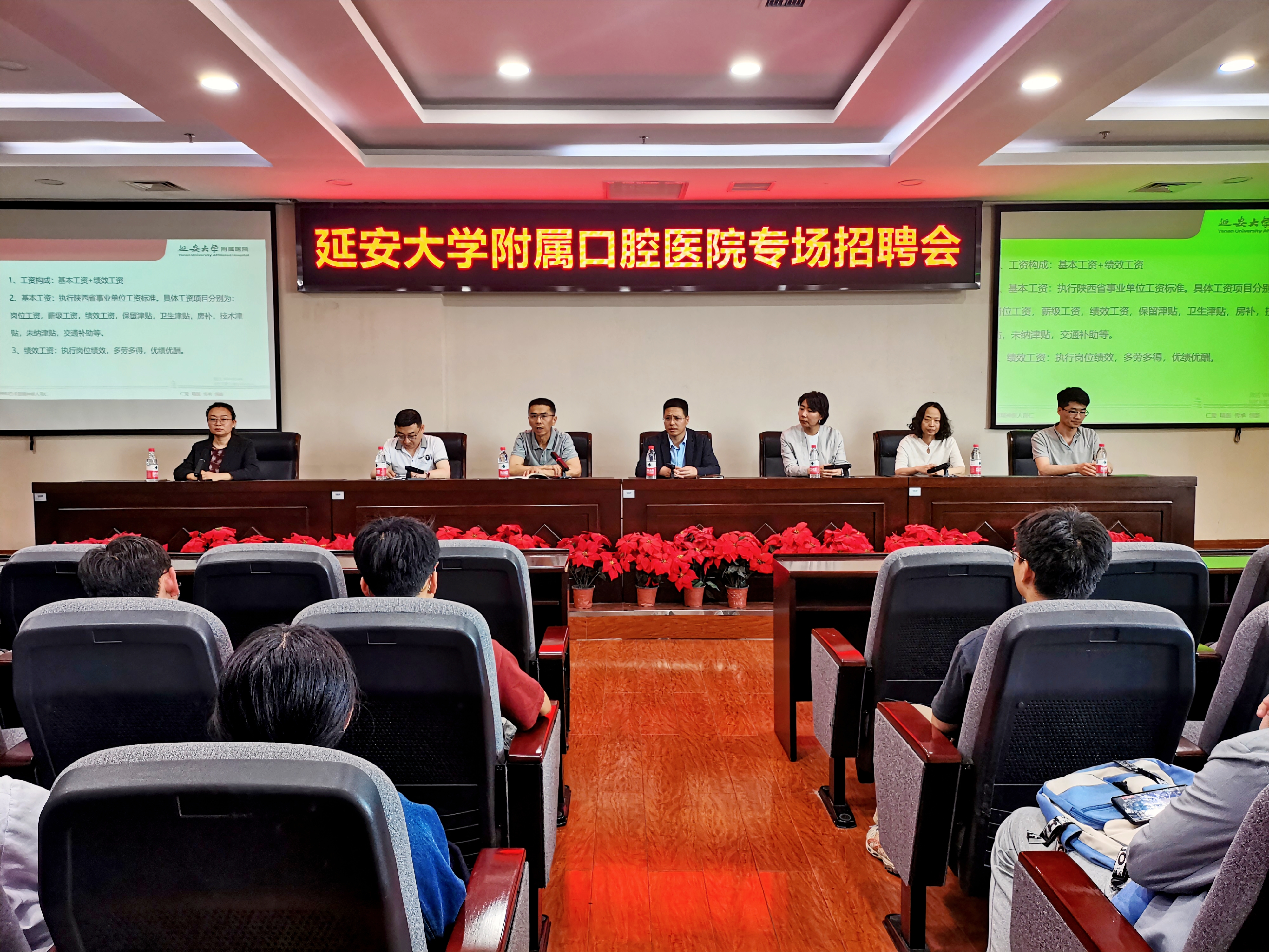5月15日上午,延安大学附属口腔医院专场招聘会在学院第一会议室如期举办。延安大学附属口腔医院负责人、人力资源部、教研室及相关科室负责人,我院党委书记贾立勤、院长黄永清、副书记王云、副院长乔光伟及教学办、学办老师和60余名毕业生参加会议。
