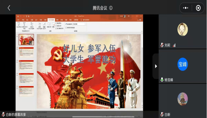 近日,我院持续积极开展毕业生就业“百日冲刺”系列活动,组织全体学生开展线上“征兵动员”政策宣讲会,邀请我院5名退伍军人白新、刘雅琴、吴大晶、赵莹莹、杨宝峰为同学们分享入伍往事。
