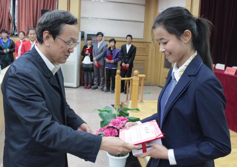 孙涛校长为获得一等奖的李佳慧同学颁发荣誉证书