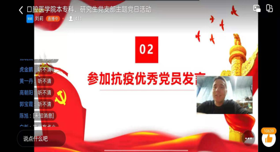 活动以本专科学生党支部宣传委员白新同志带领大家一起学习党的十九届六中全会精神拉开帷幕。随后,10位党员同志、团员代表与主持人连麦,结合学习党的十九届六中全会精神,向全体党员及同学们分享了自己难忘的抗疫经历与心得感悟: