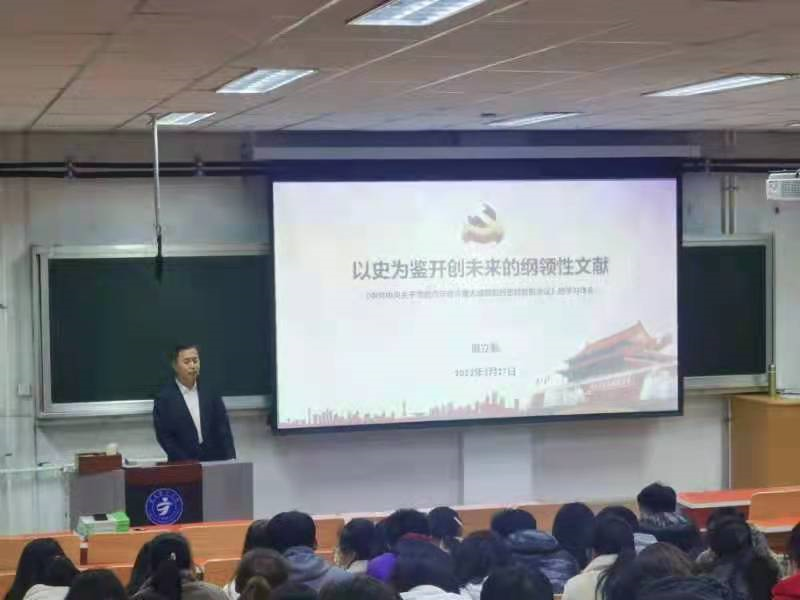 在雁湖校区,王云以“学习贯彻党的十九届六中全会精神、紧跟‘最牛团队’逐梦‘星辰大海’”为主题,与2020级、2021级本科学生进行交流分享。她首先以“一起向未来——北京冬奥会”为切入点,以点带面展现我们党团结带领全国各族人民百年奋斗取得的重大成就。随后,又以“百年再起航——党的十九届六中全会”为题,与同学们一起学习党的十九届六中全会主要精神。她鼓励同学们,要认真学党史,跟党走,在“四史”学习中不断汲取经验和奋进力量,砥砺新征程,书写青春华章。最后,她强调同学们在校期间,一定要按照学校要求,扎实做好疫情防控各项相关工作,共同营造一个良好的校园氛围,尽快进入学习状态,以良好的精神姿态投入到紧张的学习中,为将来实现中华民族伟大复兴的中国梦贡献青春力量与智慧奠定坚实的基础。
