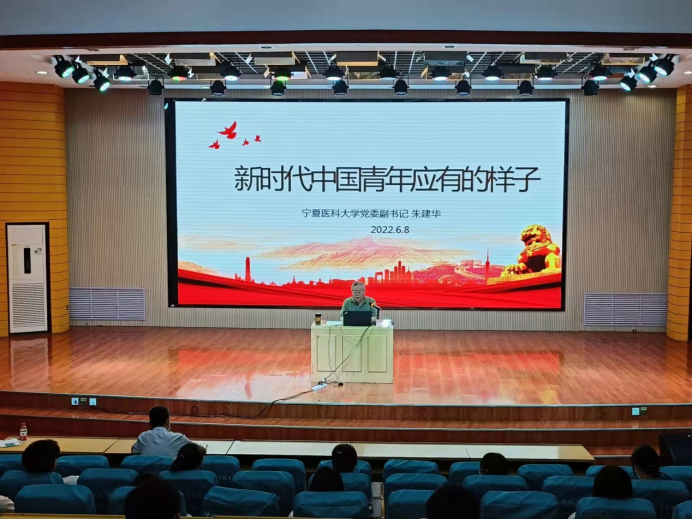 朱建华紧紧围绕习近平总书记在中国共产主义青年团成立100周年大会上的讲话的学习体会进行讲授。从“要做理想远大、信念坚定的模范”“要做刻苦学习、锐意创新的模范”“要敢于斗争、善于斗争的模范”“要做艰苦奋斗、无私奉献的模范”“要做崇德向善、严守纪律的模范”等“五个模范”,阐述了新时代青年的担当与使命,新时代青年应勇立潮头。从中国共产党和中国共青团的发展历程,强调“一个时代有一个时代的主题,一代人有一代人的使命”,广大青年要以永不懈怠的精神状态、永不停滞的前进姿态,以越是艰难越向前的英勇气概和敢教日月换新天的昂扬斗志,自觉肩负起时代重任,深度剖析了青年命运与时代的关系。从新时代青年要“靠得住”“行得稳”“看得远”等三个方面,要求广大青年要做时代需要的新青年,把对祖国血浓于水、与人民同呼吸共命运的情感贯穿学业全过程、融汇在医学事业追求中,始终成为推进时代发展、实现民族复兴的先锋力量。