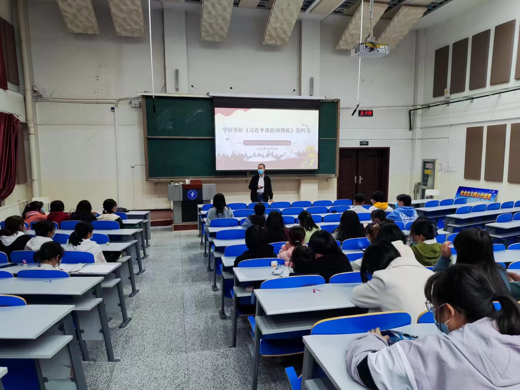 2022年10月9日19时,口腔医学院党委在雁湖校区开展《习近平谈治国理政》第四卷宣讲工作,由学院党委书记贾立勤主讲,雁湖校区130余名学生聆听了讲座。