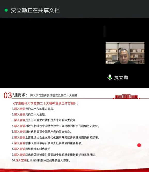 11月14日19:00,院党委书记贾立勤以腾讯会议形式讲授了专题党课,两院领导班子成员、学院教职工及医院党员60余人参加了党课。