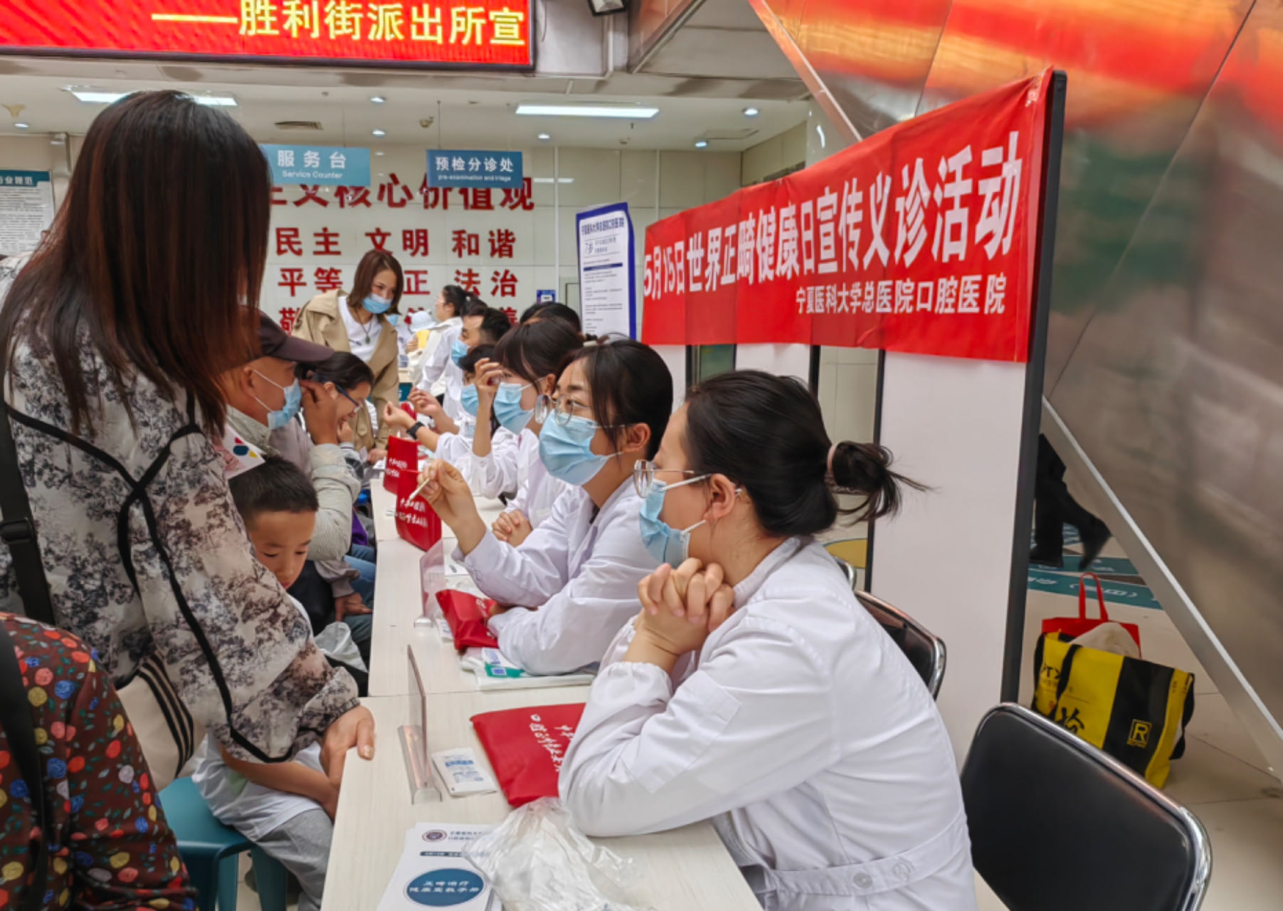 活动期间,口腔医(学)院师生员工和医务工作者走进兴庆区红房子幼儿园、金凤区第二十七小学,对孩子们进行口腔卫生、错合畸形诊查,教授孩子们正确的刷牙方法,开展了以“如何进行口腔卫生维护及错合畸形早知道”为主题的科普讲座。在学校雁湖校区尚德广场和总医院门诊一楼义诊活动的现场,向大家讲解口腔健康的重要性,分享口腔保健相关知识,根据不同人群的口腔情况提出初步诊疗建议。在科普宣讲中,口腔医(学)院正畸科主任雍敏教授接受银川日报专访,解答导致牙齿畸形的原因是什么,出现牙齿畸形什么时候矫正最好,呼吁家长们对孩子们的口腔健康问题要“早发现、早诊断、早治疗”,培养孩子们良好的口腔卫生习惯,守护孩子们的健康成长和灿烂笑容。口腔医(学)院口腔正畸科陆逊老师、杨艺强老师走进专家名医直播间,以“牙齿问题早关注——健康美丽,从牙开始”为主题进行网络直播,详细地回答网民就诊疑问。