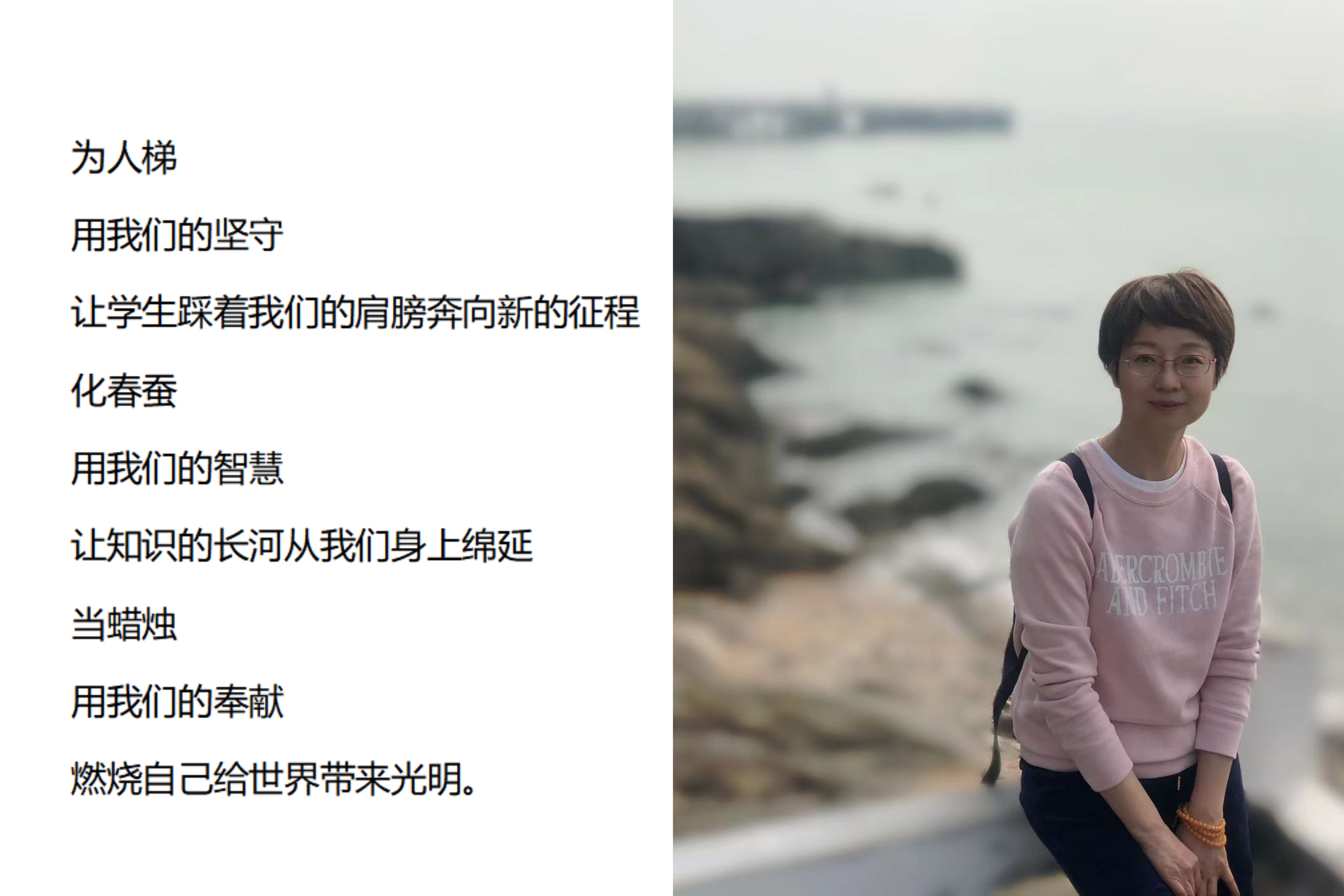 选择教师这个职业,就意味着一份责任,一种使命。本着“干一行,爱一行,钻一行”的精神,从教以来,辛勤耕耘。在教坛上,她默默无闻地工作,认真地备好每一节课,认真地解答学生每一个疑惑。以她渊博的知识和严谨的治学精神深受学生们的喜爱和敬重。看着懵懂迷茫地学生在自己的精心培养下成长为博学自信的翩翩少年,她享受到了“一朵云推动另一朵云,心灵成就心灵的”快乐并将其作为自己的教育信念。所以她乐享教坛,孜孜不倦。