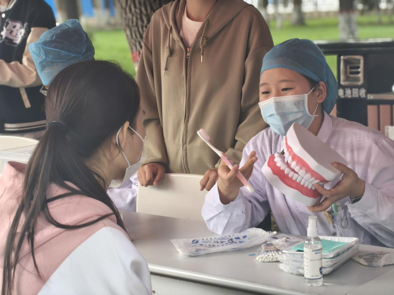 活动现场,“青春‘齿’刻促民族团结 口腔义诊绽健康之花”红色横幅格外醒目,吸引众多师生踊跃参与。义诊区由口腔专业教师和研究生团队组成,为师生细致开展口腔检查,针对不同口腔问题提供个性化护齿建议;宣讲区通过趣味科普,阐释高糖食品对口腔的危害,还现场生动演示巴氏刷牙法与牙线使用技巧,帮助师生掌握科学护齿方法。